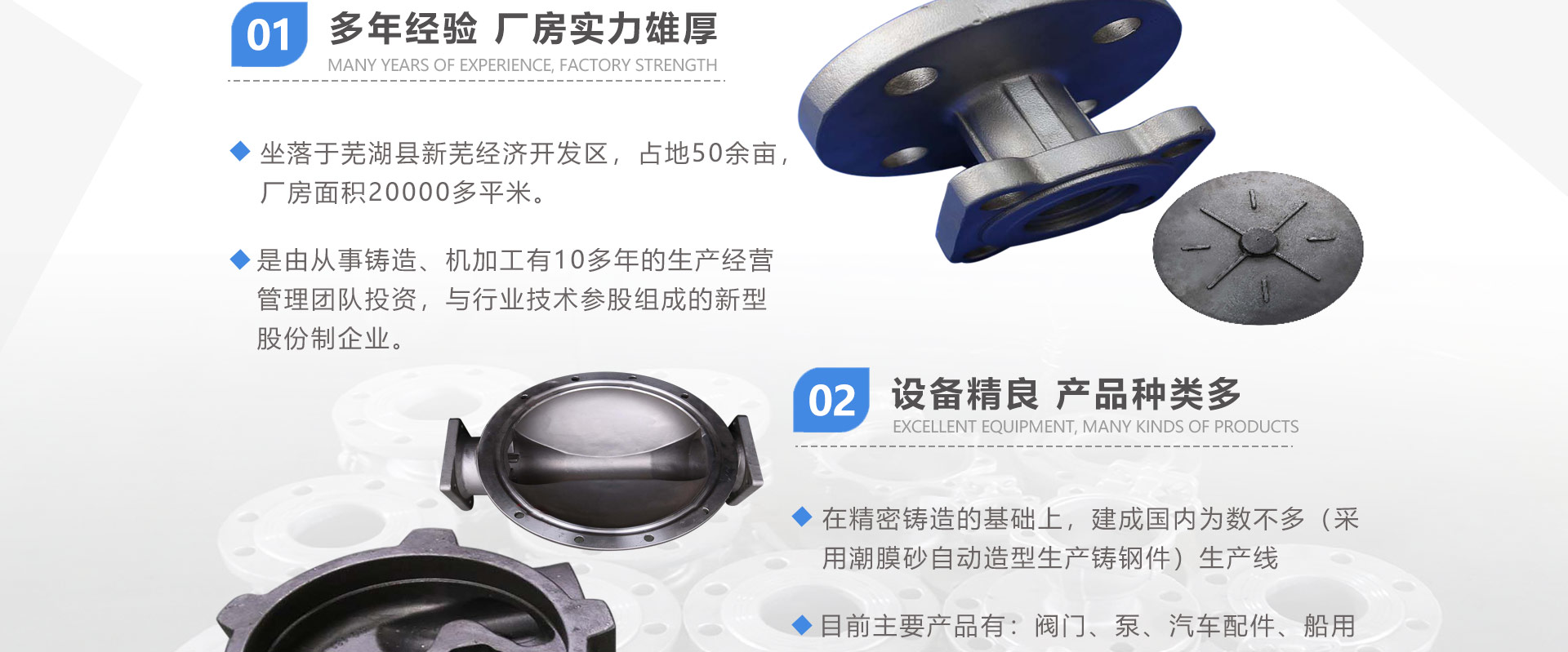 安徽偉工機(jī)械科技有限公司,坐落于安徽蕪湖新蕪經(jīng)濟(jì)開(kāi)發(fā)區(qū),是一家専業(yè)從事鑄造產(chǎn)品設(shè)計(jì)、研發(fā)、生產(chǎn)、銷(xiāo)售于一體的企業(yè),公司為客戶(hù)的產(chǎn)品提供多樣的技術(shù)支持與設(shè)計(jì),公司主要鑄造技術(shù)有潮模砂鑄造、硅溶膠精鑄工藝。主要產(chǎn)品有:不銹鋼閥門(mén)配件、泵閥配件、汽車(chē)配件、工業(yè)管道配件、工程機(jī)械配件、汽車(chē)配件等。材質(zhì)為:低合金鋼、304、316、316L、鉻鉬鋼、哈氏合金、碳鋼、雙相鋼等。公司已先后通過(guò)ISO9001和TS16949等多種體系審核,以完備的管理手段和齊全的檢測(cè)設(shè)備滿(mǎn)足客戶(hù)需求,進(jìn)的設(shè)備,専業(yè)的技術(shù),嚴(yán)謹(jǐn)?shù)墓芾恚€(wěn)定的質(zhì)量。服務(wù)客戶(hù),鑄造未來(lái),偉工誠(chéng)摯的歡迎新老客戶(hù)共同商洽合作